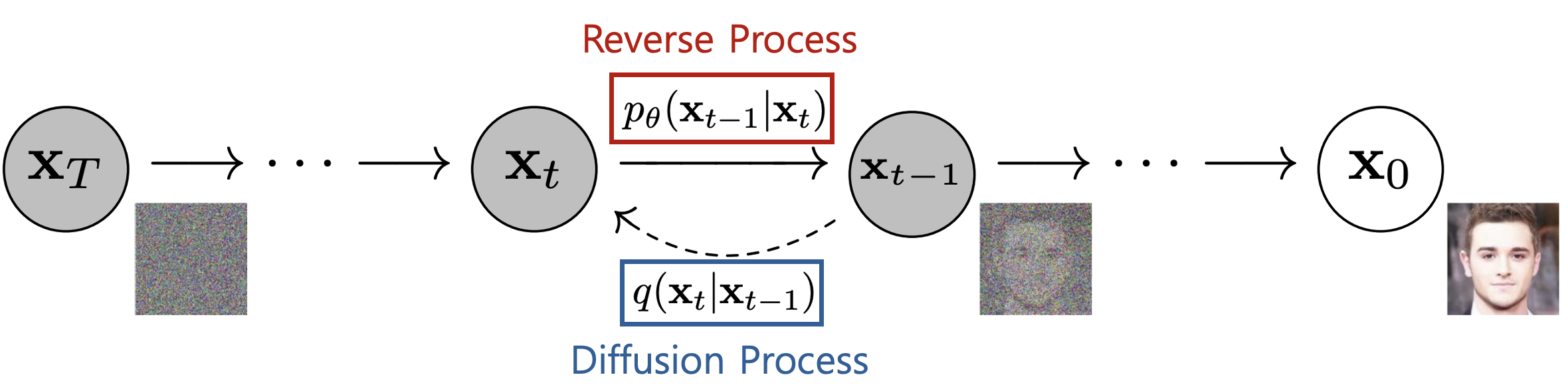 이 Reverse Process $q\left(\mathbf{x}_{t-1} \mid \mathbf{x}_{t}\right)$ 를 모델링 하는게 어려움😬