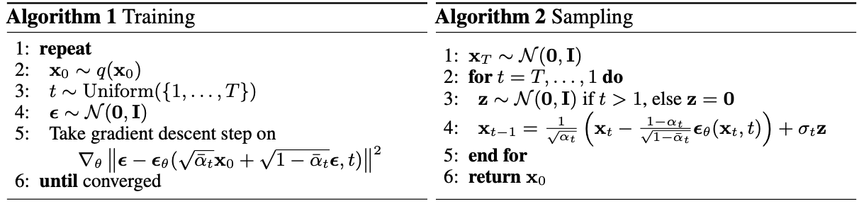 이 때, $\boldsymbol{\mu}_\theta\left(\mathbf{x}_t, t\right), \sum_\theta\left(\mathbf{x}_t, t\right)$ 은 learnable parameter