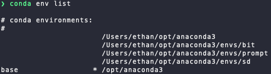 우리는 'base' 라는 환경 대신 'sd' 라는 이름의 방금 만든 가상환경을 사용할 예정인데, 먼저 내가 어떤 가상환경을 가지고 있는지 확인하는 명령어 입력