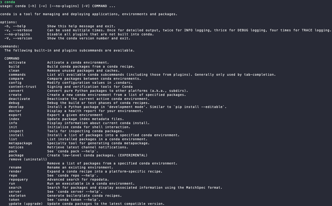 - Command + Space 로 터미널(terminal) 검색하여 실행하고 conda 입력하여 아래와 같은 내용이 나오는지 확인