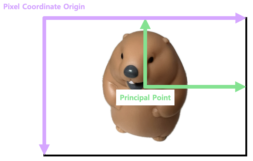 - Camera Coordinate System 에서 이어진 z축이 image plane 과 만나는 점, 즉 Principal Point 를 origin 으로 하는 좌표계