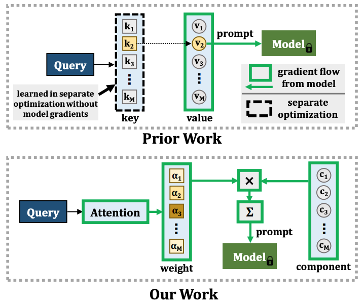Prompt paramter: $\boldsymbol{p}=\sum_{m}^{}\alpha _m\textbf{P}_\textbf{m}$, weighted sum over prompt components