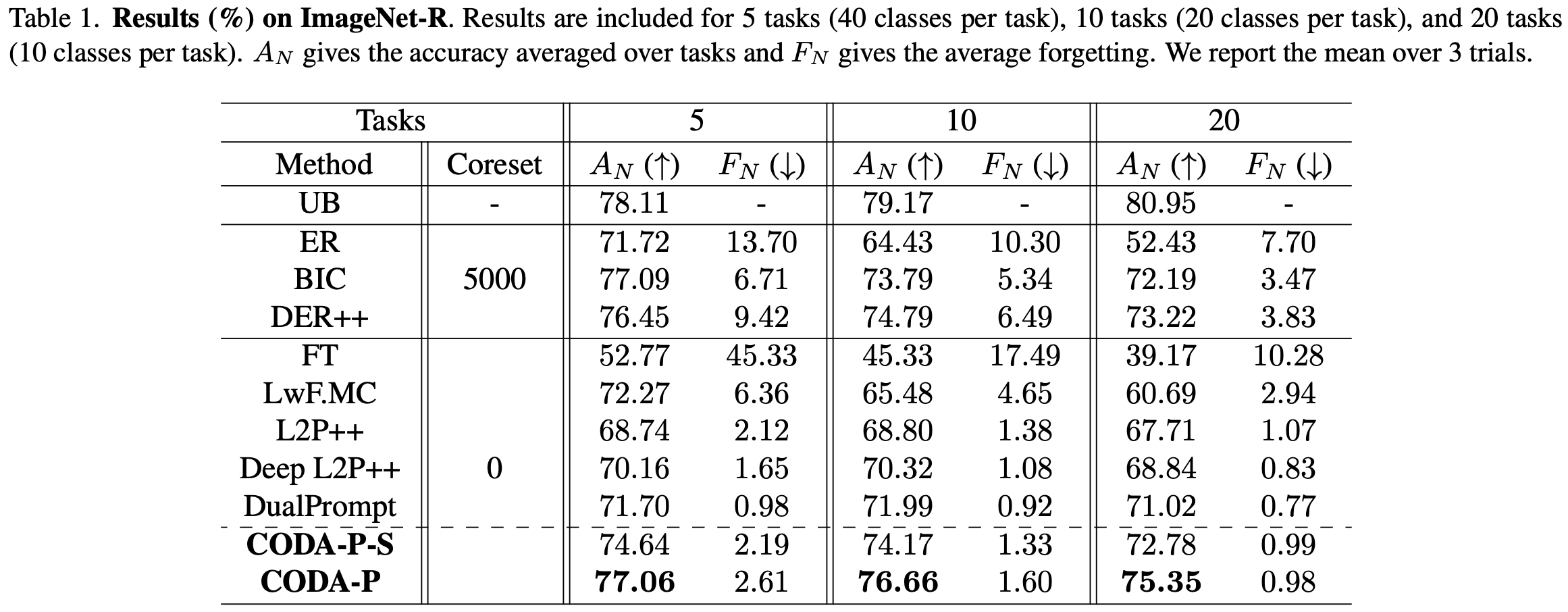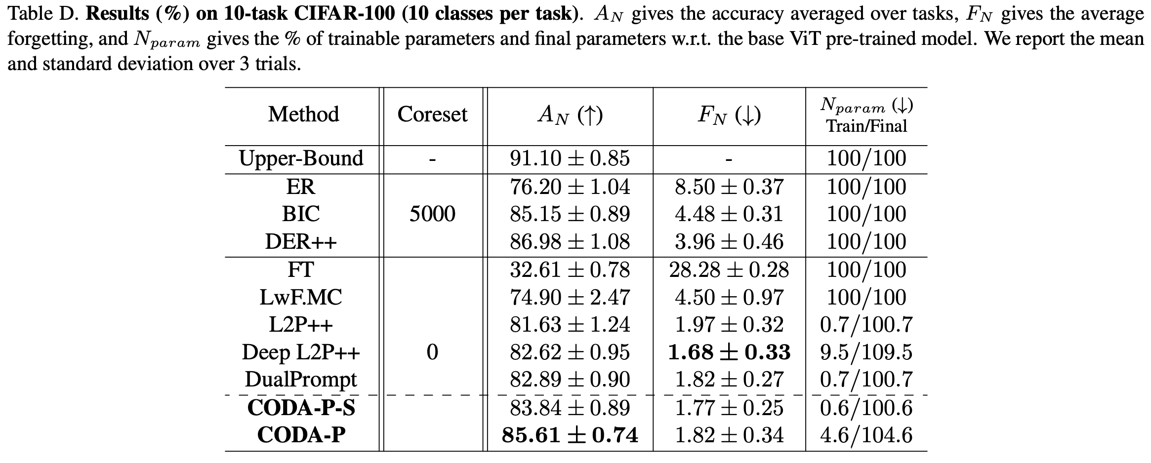 [1] Smith, James Seale, et al. "CODA-Prompt: COntinual Decomposed Attention-based Prompting for Rehearsal-Free Continual Learning." CVPR 2023 [Paper link]