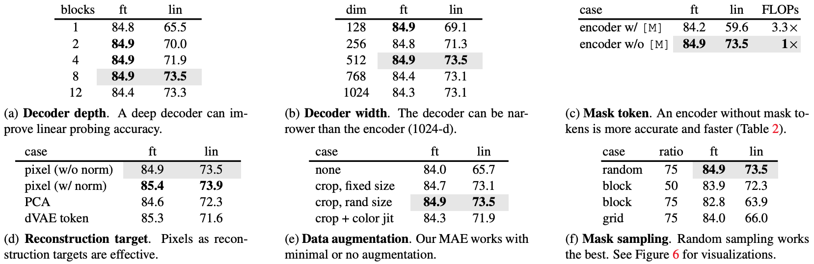 Ablations (Decoder design, Mask token, Reconstruction target, Data augmentation, Mask sampling strategy)