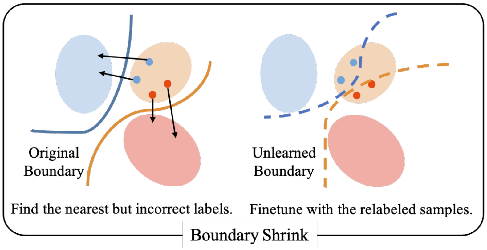Boundary Shrink: Breaks the decision boundary of the forgetting class by splitting the forgetting features into other classes