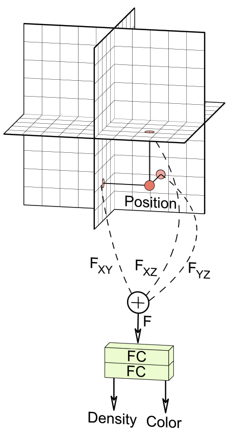 3D position $x \in \mathbb{R}^3$ 가 있을 때, 각 feature plane 에 projection 후 summation 하고 decoder 를 통과해서 density 와 color 구함
