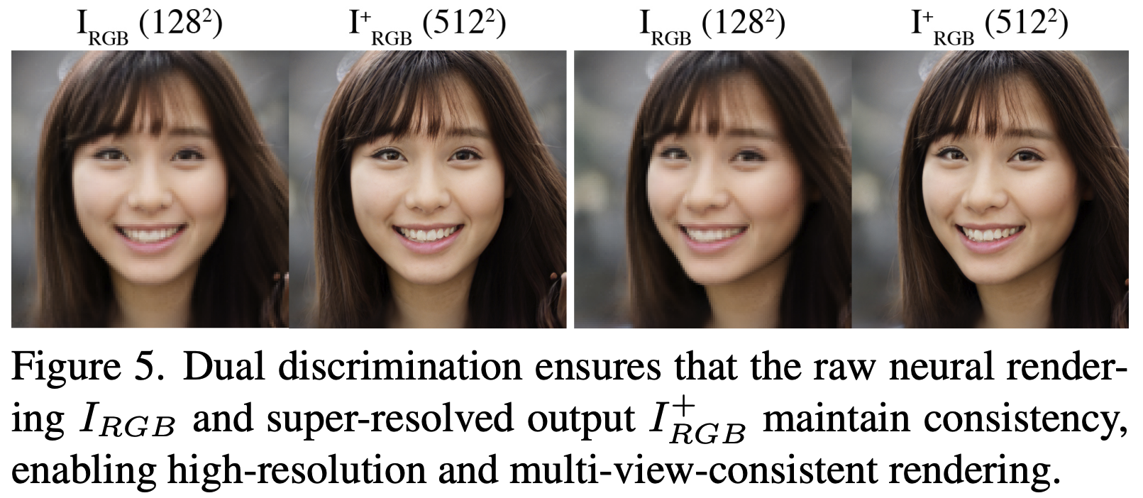 - Dual discrimination strategy 를 사용하여 neural rendering 과 final output 사이의 consistency 를 유지하여 바람직 하지 않은 view 의 불일치를 regularize
