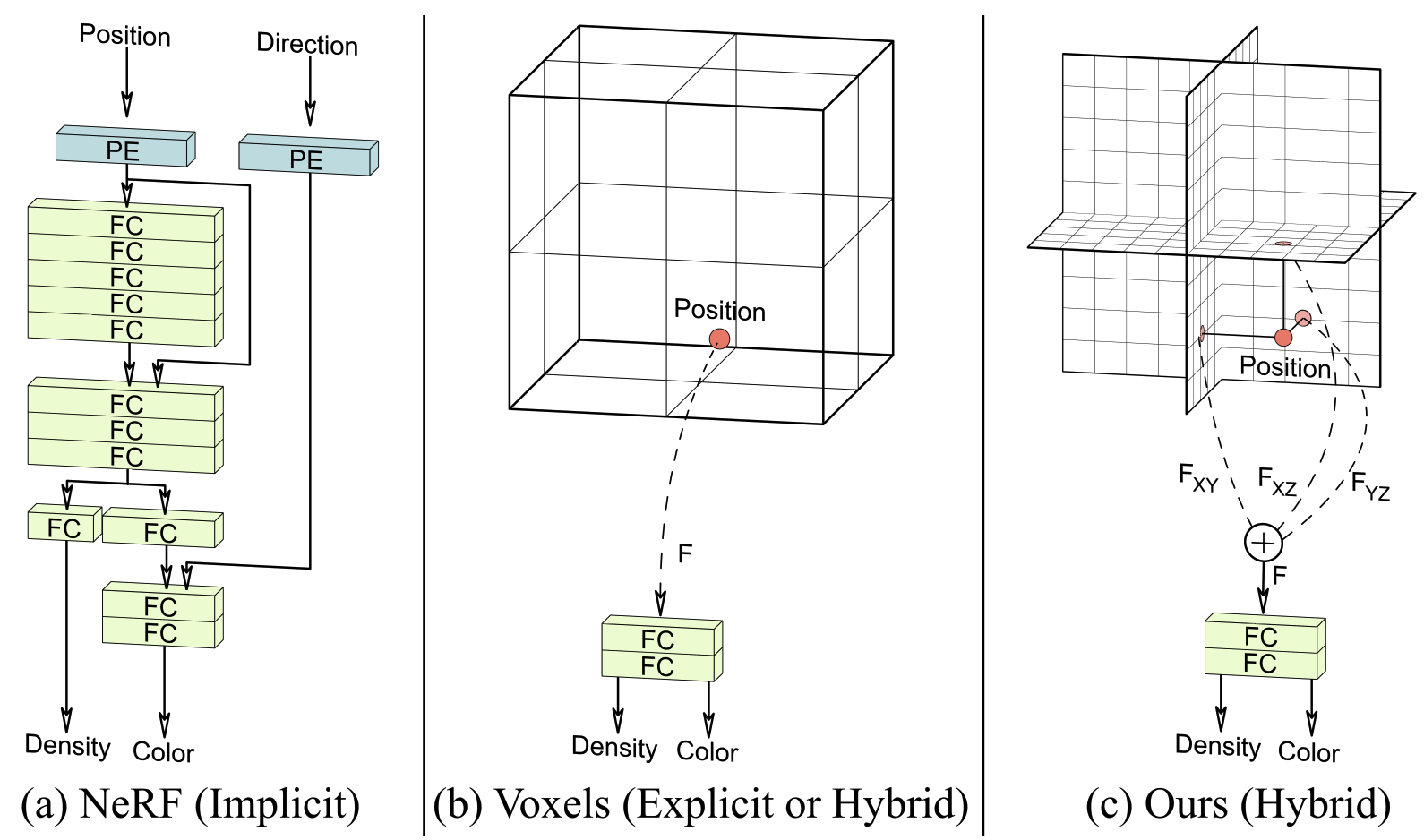 Explicit feature 를 3개의 axis-aligned orthogonal feature planes 에 align (Resolution 은 $N \times N \times C$, $N$ 은 Spatial res, $C$ 는 Channel num)
