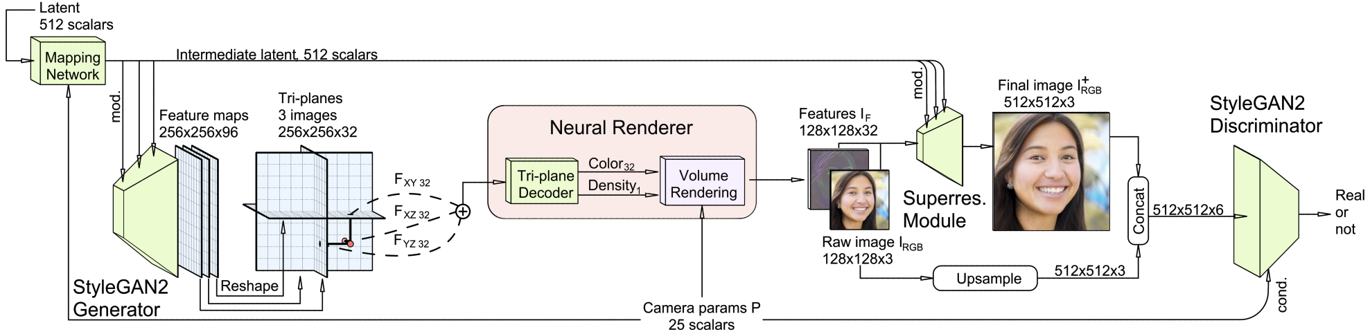 먼저 styleGAN2 를 이용하여 $256 \times 256 \times 96$ feature map 을 구하고, 각각 32 channel 을 갖는 tri-plane 생성