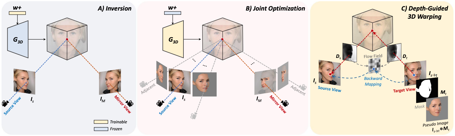 - 사람의 얼굴이 symmetrical 하다는 점을 이용하는 3D GAN inversion method 제안