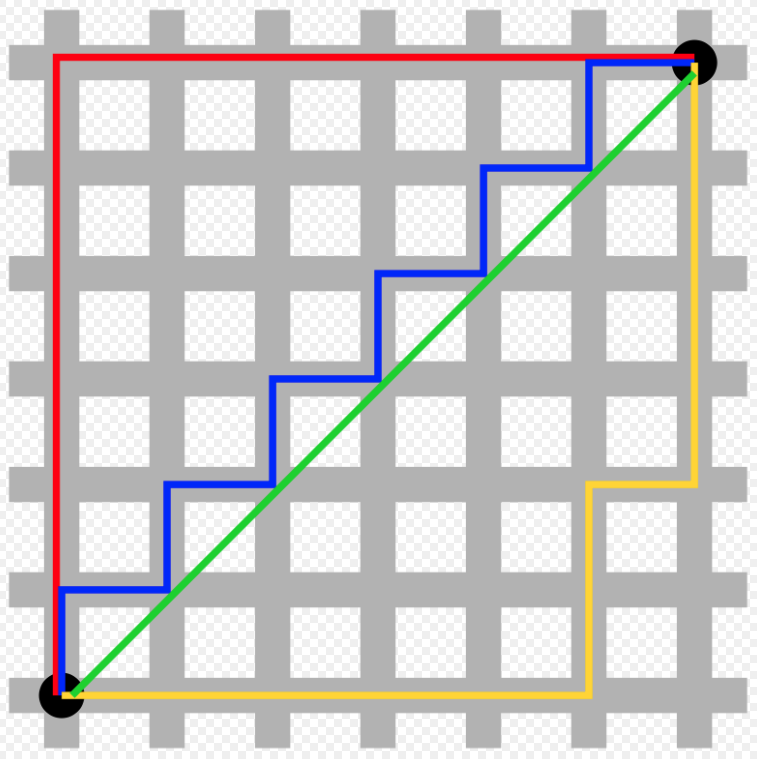 Manhattan distance 라고도 부르는데 도시에서 이동하는 것 같은 형태를 보이기 때문이지 않을까 싶음