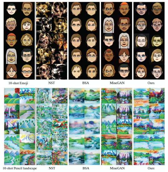 Mode Collapse : GAN 에서 학습시키려는 모델이 실제 데이터를 커버하지 못하고 다양성을 잃어버리는 현상 위 그림에서 BSA 의 예시를 보게 되면 모두 다 비슷한 이미지를 생성한다는 것을 관찰할 수 있다. 이런 문제는 Discriminator 와 Generator 학습의 불균형으로 Generator 가 계속 같은 종류의 이미지를 생성하려고 하면서 발생하게 된다. 참고문헌 [1] Li, Yijun, et al. "Few-shot image generation with elastic weight consolidation." arXiv preprint arXiv:2012.02780 (2020).